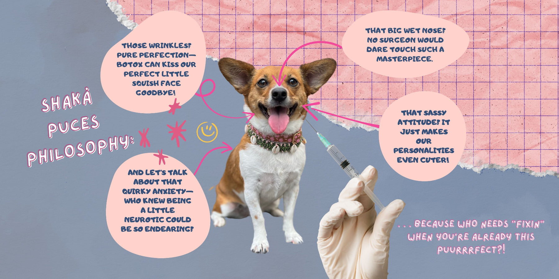Those wrinkles? Pure perfection—botox can kiss our perfect little squish face goodbye! That big wet nose? No surgeon would dare touch such a masterpiece. And let’s talk about that quirky anxiety—who knew being a little neurotic could be so cute and endearing? That sassy attitude? It just makes our personalities even more irresistible!